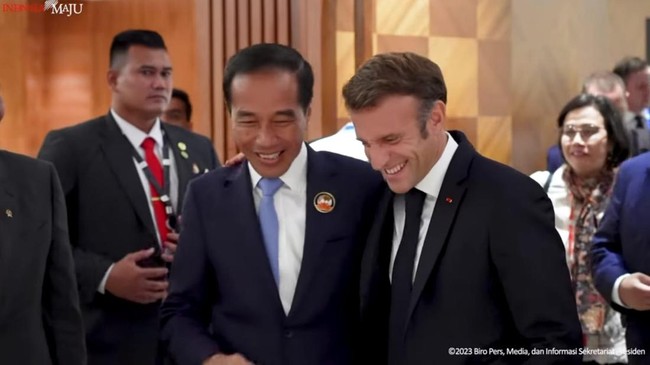 "You know, you're the most popular after G20 Summit in Bali," kata Jokowi kepada Macron. Terlihat Macron, yang merangkul Jokowi, pun tampak tertawa.