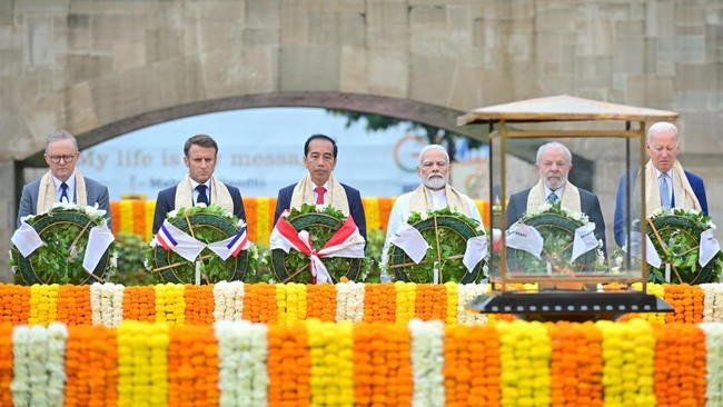 Setiba di sana, para pemimpin negara berdiri mengelilingi Mahatma Gandhi Memorial. Jokowi yang berdiri di antara PM Modi dan Presiden Prancis Emmanuel Macron pun kemudian memberi penghormatan kepada Mahatma Gandhi dengan karangan bunga yang telah diletakkan di hadapan masing-masing.