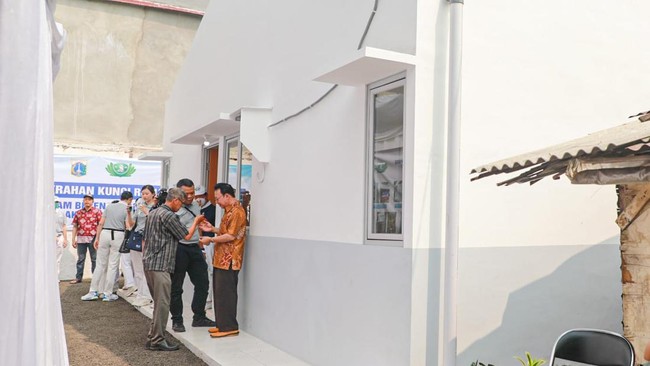 Penjabat (Pj) Gubernur DKI Jakarta Heru Budi Hartono menyerahkan secara simbolis kunci rumah yang telah direnovasi ke warga. Heru juga masuk dan mengecek langsung rumah tersebut.