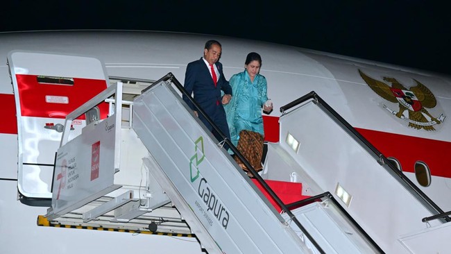Presiden Joko Widodo (Jokowi) dan Iriana Joko Widodo tiba di Tanah Air usai mengikuti rangkaian Konferensi Tingkat Tinggi (KTT) G20 di New Delhi, India. Jokowi disambut sejumlah pejabat begitu turun dari pesawat.