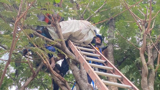 Dalam video yang dibagikan, terlihat sejumlah petugas damkar menaiki pohon tersebut. Mereka menggunakan tangga untuk menaiki pohon.