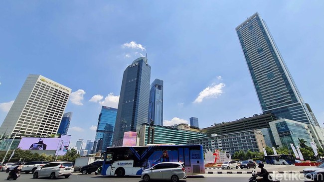 Langit Jakarta cerah berwarna biru disertai dengan gugusan awan putih siang kemarin dan hari ini. Hal itu terjadi seiring kualitas udara Jakarta membaik setelah teknologi modifikasi cuaca (TMC) dengan metode water mist spraying dilakukan.