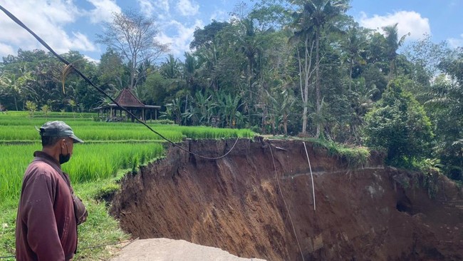 Jalan yang menjadi akses wisata di Gianyar, Bali amblas sedalam 70 meter dengan lebar lebih dari 30 meter. Kejadian ini membuat akses wisata menuju Tampaksiring terputus.
