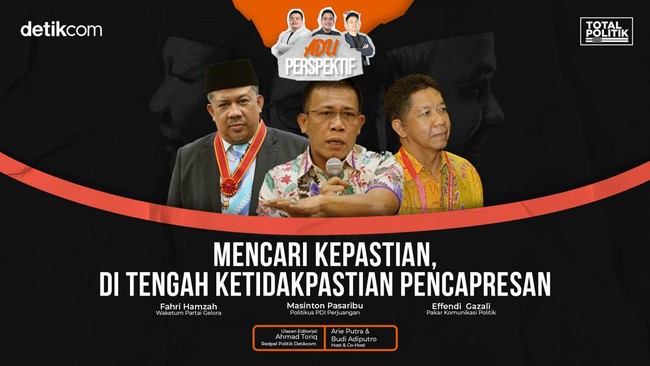 Dengan latar belakang situasi politik saat ini, Adu Perspektif akan membahas seruncing apa manuver-manuver akan terjadi dalam waktu dekat. Menghadirkan Fahri Hamzah (Waketum Partai Gelora), Masinton Pasaribu (Politikus PDI Perjuangan), serta Effendi Gazali (Pakar Komunikasi Politik), saksikan secara Live Adu Perspektif dengan tema 'Mencari Kepastian, Di Tengah Ketidakpastian Pencapresan' Rabu, 13 September 2023 pukul 20.00 WIB di web dan kanal Youtube detikcom.