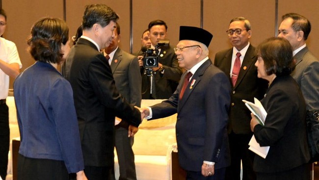 Sementara Wapres Ma'ruf didampingi oleh Duta Besar RI untuk China Djauhari Oratmangun, Kepala Sekretariat Wapres Ahmad Erani Yustika, hingga jajaran Setwapres lainnya.