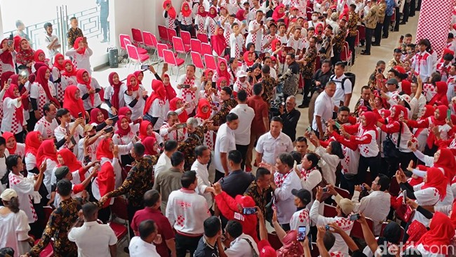 Jokowi juga tampak sempat bersalaman dengan sejumlah relawan yang hadir. Para relawan kemudian berebut untuk bisa bersalaman dengannya.
