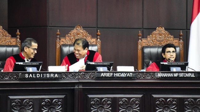 Untuk diketahui, sembilan hakim MK mewakili unsur eksekutif, legislatif, dan yudikatif. Tiga wakil eksekutif itu adalah Saldi Isra, Enny Nurbaningsih, dan Daniel. Sedangkan dari unsur legislatif ialah Aref Hidayat, Wahiduddin Adams, dan Guntur Hamzah. Adapun dari yudikatif adalah Anwar Usman, Suhartoyo, dan Manahan Sitompul.