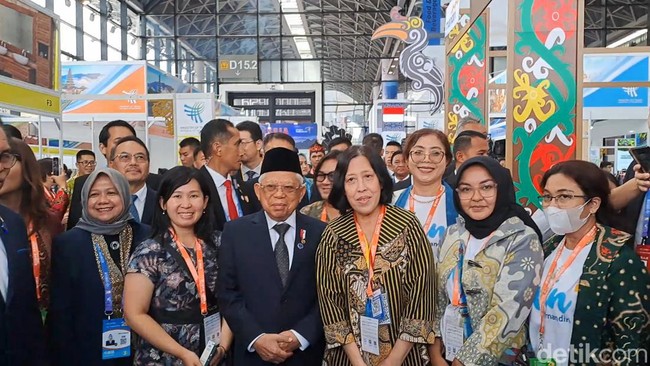 detikcom memantau di Nanning International Convention and Exhibition, Sabtu (17/9/2023), Ma'ruf meninjau stan di paviliun bersama Wakil Ketua Kongres Rakyat Nasional Komite Guangxi Zhou Jiabin.