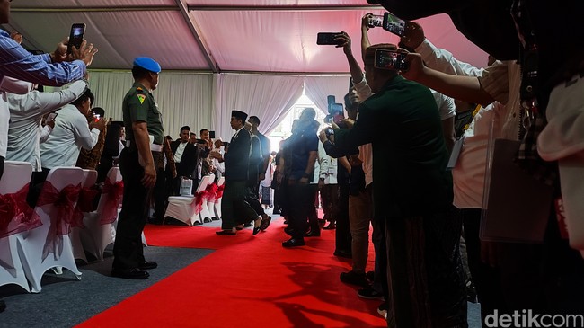 Pantauan detikcom, Jokowi tiba di Pondok Pesantren Al Hamid, Cilangkap, Jakarta Timur, sekitar pukul 08.20 WIBw, Senin (18/9/2023. Jokowi tampak mengenakan sarung berwarna hijau dipadukan dengan jas hitam.