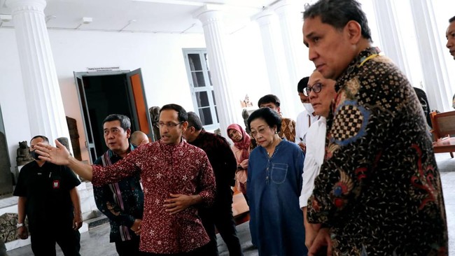 Namun, dari foto-foto yang dikirim oleh tim media PDIP, Nadiem mendampingi Megawati saat berjalan di area Museum Nasional. Nadiem pun terlihat menjelaskan sesuatu kepada Megawati dan rombonganya.