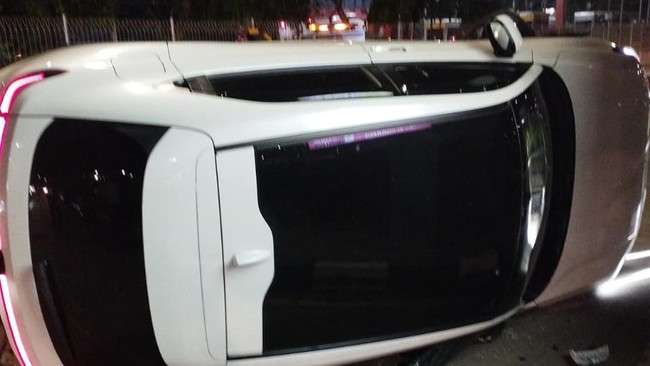 Dari foto yang diunggah TMC Polda Metro Jaya, lampu depan dan belakang mobil tersebut masih menyala saat terguling. Sisi mobil yang terguling pada bagian kanan.