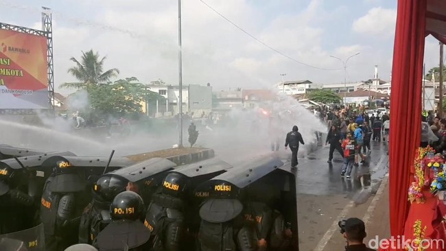 Massa yang tidak puas pun menyerang polisi dengan menggunakan senjata tajam serta melemparkan batu dan berbagai benda tumpul. Mobil water cannon dikerahkan.