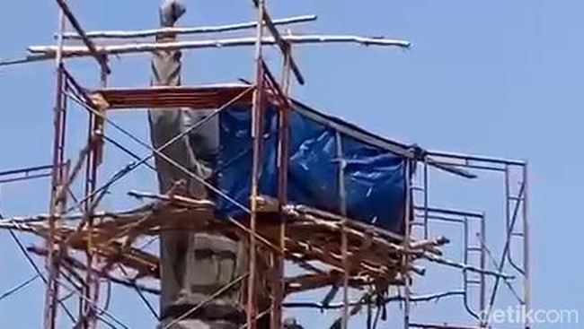 Pantauan detikSumbagsel, Jumat (22/9/2023), pembangunan patung di dekat lokasi pembangunan GOR di Jalan Lingkar Pemkab Banyuasin itu masih dalam tahap pengerjaan oleh tukang. Pada bagian wajah kini ditutup terpal dan dirombak kembali.