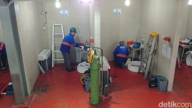 Teknisi-teknisi AC beraksi melakukan perbaikan hingga memasang unit AC. Mereka ternyata sedang mengikuti kompetisi yang digelar Kementerian Lingkungan Hidup dan Kehutanan (KLHK) serta Kementerian Ketenagakerjaan (Kemnaker).