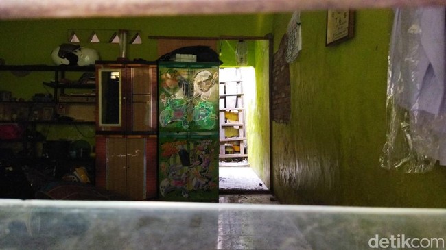 Pada bagian ruang tamu, terlihat barang-barang sudah tidak tertata rapi, seperti lemari, rak, helm serta buku-buku dan pakaian. Kayu sisa-sisa reruntuhan pun tampak di lantai.
