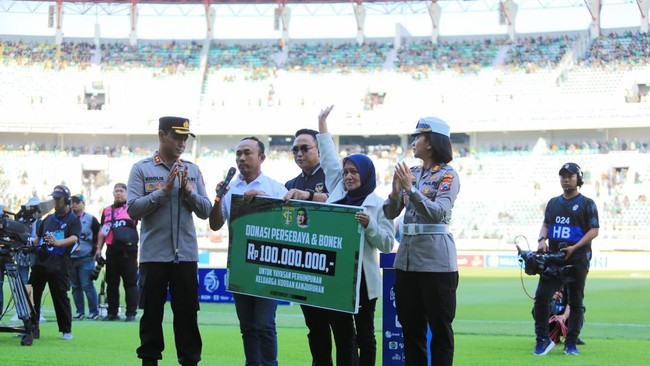 Donasi sejumlah Rp 100 juta tersebut diberikan kepada Perkumpulan Keluarga Korban Kanjuruhan menjelang kick-off laga yang mempertemukan Persebaya melawan Arema FC, Sabtu (24/9/2023). Penyerahan donasi ini menjadi bukti nyata kepedulian Persebaya Surabaya, klub legendaris asal Jawa Timur, dan suporter fanatiknya, Bonek, terhadap korban Tragedi Kanjuruhan yang terjadi beberapa waktu lalu.