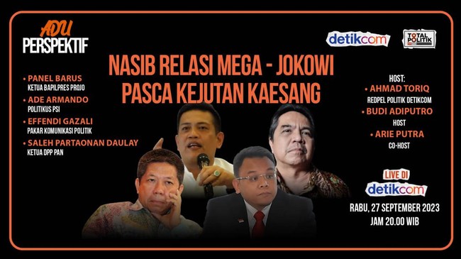 Adu Perspektif malam ini mengangkat tema 'Nasib Relasi Mega - Jokowi Pasca Kejutan Kaesang' bersama Panel Barus (Ketua Bapilpres Projo), Ade Armando (Politikus PSI), Effendi Gazali (Pakar Komunikasi Politik) dan Saleh Partaonan Daulay (Ketua DPP PAN). Acara disiarkan secara langsung Rabu (27/9/2023) di 20detik dan seluruh kanal sosial media detikcom.