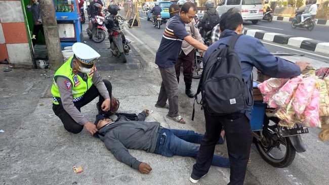Kemudian saksi inisial R (31) melapor ada pengendara motor tiba-tiba kejang-kejang. Pihak kepolisian pun membantu membaringkan korban.