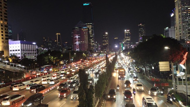 Pantau detikcom, dari jembatan penyeberangan orang (JPO) depan Polda Metro Jaya, Jakarta Pusat, pada pukul 18.32, kemacetan sudah terlihat. Kendaraan terlihat memenuhi sepanjang jalan.