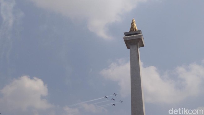 Terdengar suara gemuruh dari mesin pesawat yang dioperasikan saat melewati kawasan itu. Armada-armada udara TNI juga ikut menari mengelilingi tugu Monas.