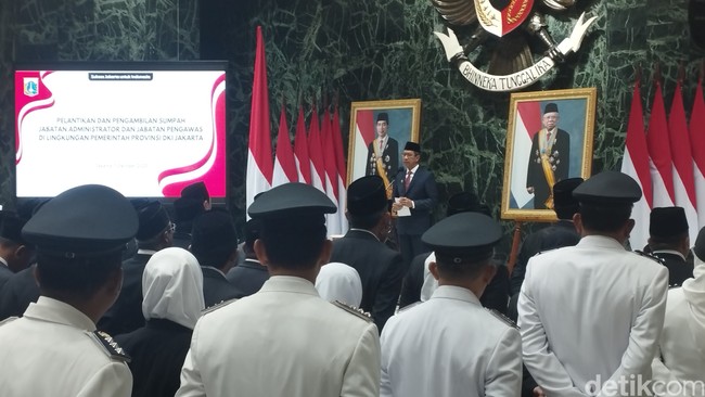 Pantauan detikcom di Ruang Balai Agung, Balai Kota DKI Jakarta, pada Selasa (3/10/2023) sore, Heru Budi melantik pejabat eselon III dan IV untuk jabatan administrator dan jabatan pengawasan di Balai Kota DKI Jakarta.
