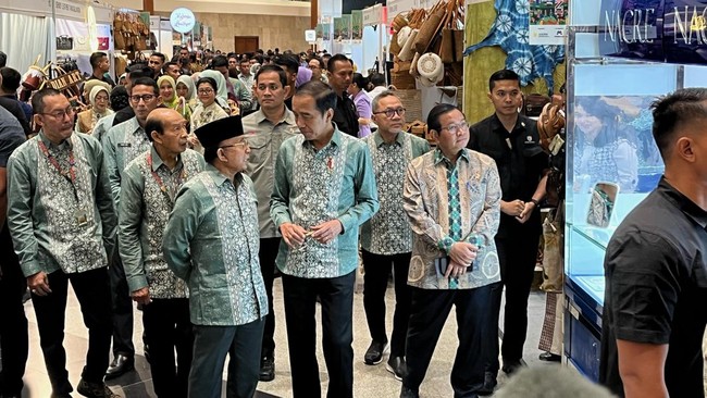 Presiden Joko Widodo (Jokowi) meninjau Pameran Inacraft on October 2023 setelah membuka acara tersebut. Jokowi didampingi beberapa menteri kabinet, di antaranya Menparekraf Sandiaga Uno, Mendag Zulkifli Hasan, hingga Mensekab Pramono Anung.