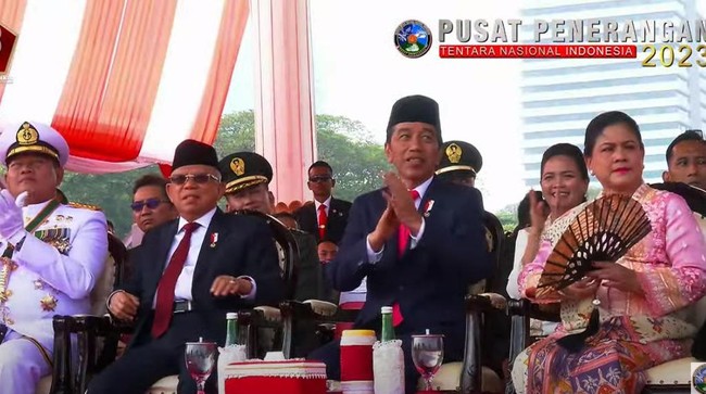 Iriana bahkan beberapa kali menggeser posisi duduk demi bisa melihat dengan jelas para penerjun payung. Selain itu, Jokowi, Iriana, dan Wapres Ma'ruf Amin beberapa kali terlihat bertepuk tangan.