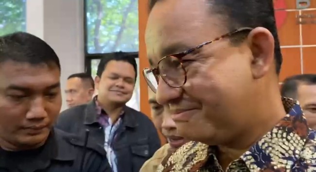 Anies tersenyum saat mendengar pertanyaan itu. Anies hanya menjawab pertanyaan tentang kehadirannya di BRIN. Dia mengaku diundang sebagai narasumber sekaligus menampung aspirasi dari para peneliti untuk Indonesia yang lebih baik.