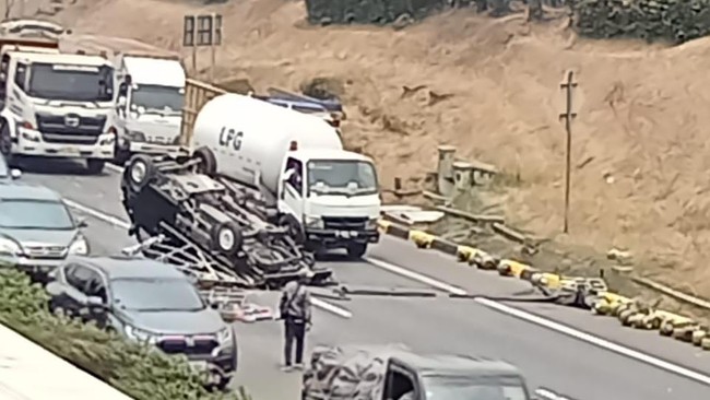 Dalam video yang diterima, terlihat mobil tersebut terbalik di lajur tengah jalan tol. Sementara tabung gas 3 kilogram yang diangkut berceceran di jalan.