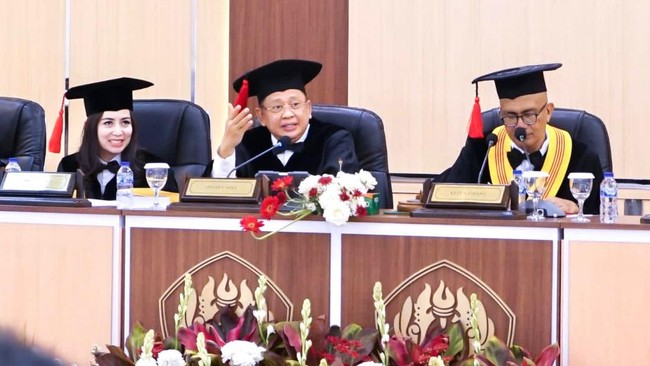 Turut hadir para penguji lainnya di antaranya, Penanggung Jawab Dr Idris, Ketua Sidang Prof Huala Adolf, Ketua Promotor Prof Ahmad M Ramli, Anggota Promotor Prof Eddy Damian dan Miranda Risang Ayu, serta Representasi Guru Besar Prof Sinta Dewi.