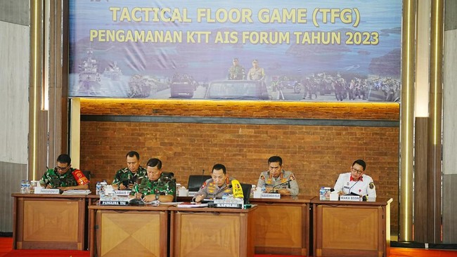 Panglima TNI Laksamana Yudo Margono dan Kapolri Jenderal Listyo Sigit Prabowo menghadiri acara Tactical Floor Game (TFG) gabungan TNI-Polri di Bali. Kehadiran Kapolri dan Panglima TNI untuk memastikan maksimalnya pengamanan event KTT Archipelagic And Island States (KTT AIS) Forum 2023 di Nusa Dua, Bali.