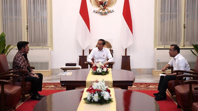 Pertemuan tersebut berlangsung pada Minggu (8/10/2023). Jokowi ditemani Mensesneg Pratikno bertemu SYL di salah satu ruangan di Istana Merdeka. Jokowi duduk di tengah dan berbincang dengan SYL.