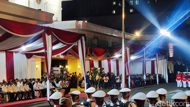 Pantauan detikcom, Upacara Parade Senja mulai digelar di halaman kantor Kemhan, Jakarta Pusat, sekitar pukul 18.00 WIB, Senin (9/10/2023).