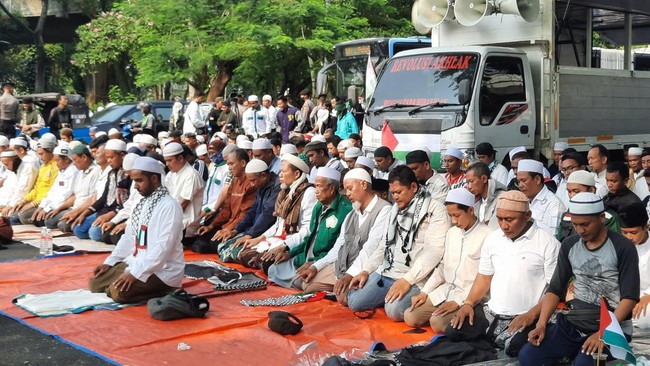 Massa Persaudaraan Alumni 212 (PA 212) menggelar demonstrasi bela Palestina di depan Kedutaan Besar Amerika Serikat (AS), Jakarta Pusat. Mereka sempat menggelar salat Asar berjemaah di depan Kedubes AS.