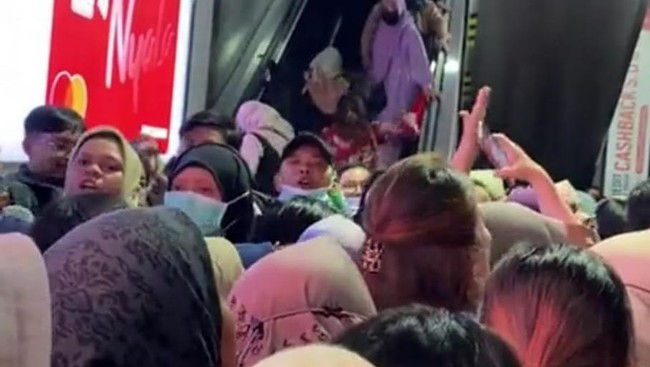 Penumpang yang berada di eskalator itu terlihat berlarian melawan arus tangga eskalator. Namun terlihat juga penumpang yang mencoba merangsek ke dalam antrean peron.