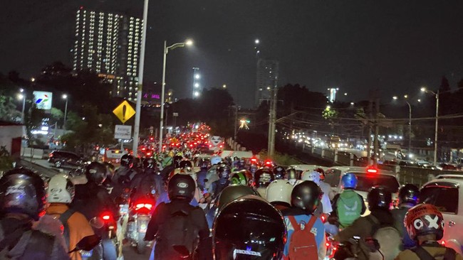 Pemotor terlihat memotong jalan melewati SPBU Pertamina untuk menghindari kemacetan. Selain itu, kemacetan juga tampak terlihat di flyover Tanjung barat menuju arah Pasar Rebo.