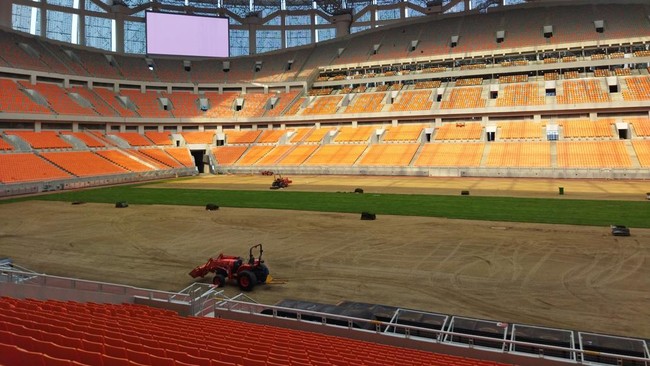 Pantauan detikcom, Sabtu (14/10/2023), tampak rumput stadion mulai dipasang pada bagian tengah lapangan. Ada juga sebagian rumput yang sudah terpasang di sisi selatan dan utara stadion.