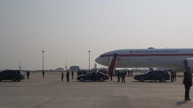 Pantauan detikcom, Jokowi dan Ibu Negara Iriana tiba di Terminal VVIP, Bandara Soekarno-Hatta, Tangerang, Banten, sekitar pukul 08.00 WIB, Senin (16/10/2023). Jokowi didampingi Menteri BUMN Menko Marves Ad Interim Erick Thohir, Seskab Pramono Anung, Mendag Zulkifli Hasan dalam kunjungan ke China ini.