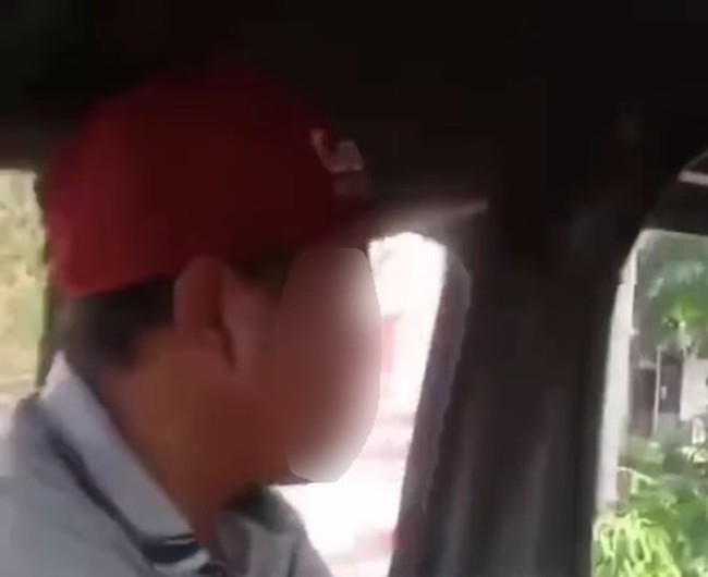 Pelaku terlihat mengenakan celana panjang berwarna cokelat, baju abu-abu, serta topi merah. Dia duduk di bangku sebelah pintu angkot dengan menghadap ke bangku panjang penumpang.