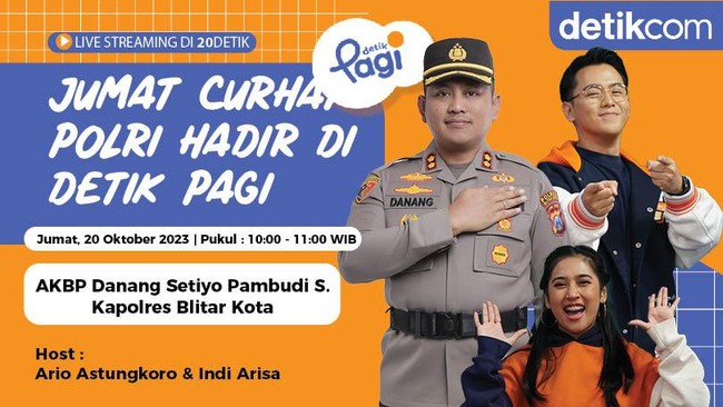 Episode kesembilan Jumat Curhat akan tayang secara live di detikPagi pada Jumat (20/10/2023). AKBP Danang siap bercerita soal kinerjanya dan jajaran di wilayah Blitar Kota.
