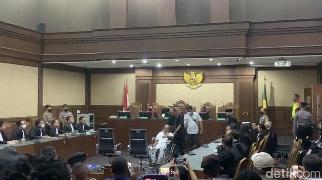 Pantauan detikcom di lokasi, Kamis (19/10/2023), Lukas Enembe memasuki ruang persidangan sekitar pukul 11.18 WIB. Lukas tampak menggunakan kursi roda.
