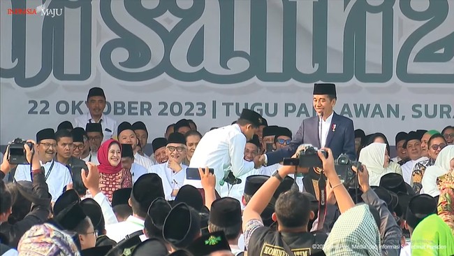 Presiden Joko Widodo (Jokowi) menghadiri apel Hari Santri Nasional 2023, di Surabaya, Jawa Timur. Dalam kesempatan itu, Jokowi memberikan tebak-tebakan ke santri yang hadir di Tugu Pahlawan.