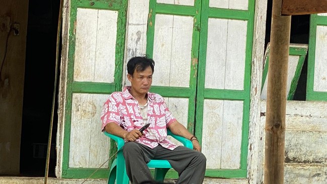 Berdasarkan foto yang diterima, Marison, yang mengenakan kemeja putih kotak merah, terlihat duduk di kursi depan rumahnya. Ia masih menenteng pedang yang digunakan untuk menikam istrinya.