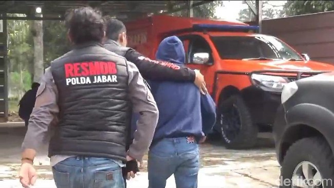 Salah satu tersangka, Danu, hadir di TKP. Dengan menggunakan sweater berwarna biru tua dengan kepala ditutup, tersangka Danu terlihat digiring oleh petugas menuju belakang rumah TKP.