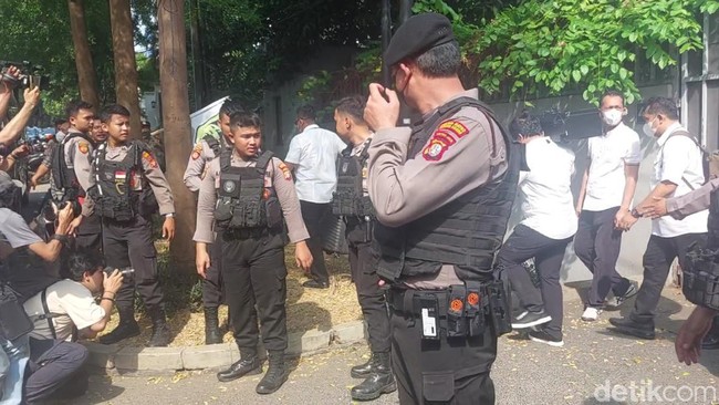 Polisi berkemeja putih masuk ke pekarangan rumah sekitar pukul 11.26 WIB, Kamis (26/10/2023). Kemudian, pukul 14.35, sekitar 10 polisi berkemeja putih keluar dari rumah itu.