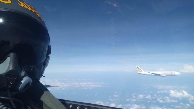 Selanjutnya, dua pesawat tempur TNI AU jenis F-16 dari Skuadron Udara 16 Lanud Roesmin Nurjadin Pekanbaru dengan call sign Rydder Flight melakukan identifikasi visual. Kemudian, dilanjutkan dengan melakukan penyergapan terhadap pesawat asing B-777 ET-AVN setelah melakukan komunikasi dengan frekuensi darurat.
