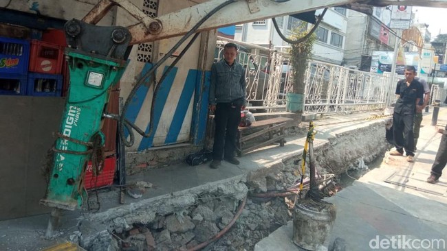 Trotoar Jalan Margonda Raya, Depok, Jawa Barat (Jabar), yang baru selesai direvitalisasi akhir taun lalu, kini dibongkar lagi. Trotoar tersebut dibongkar untuk perbaikan saluran air.