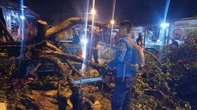 Pohon belimbing setinggi 15 meter itu tumbang ketika terjadi hujan deras disertai angin kencang, sekitar pukul 18.30 WIB. Pohon yang tumbang sempat menutup jalan dan menyebabkan macet.