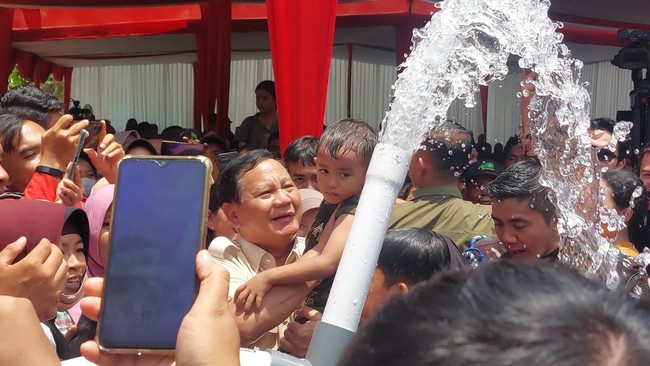 Menteri Pertahanan Prabowo Subianto meresmikan pembuatan sumur bor air bersih di Banyumas, Jawa Tengah. Prabowo sempat bermain air dengan anak-anak sekitar.