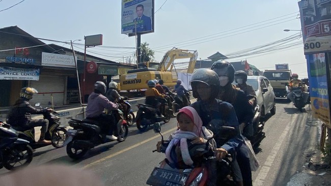 Pengendara dari arah Sawangan pun harus mengantre untuk berbelok kiri ke arah Jalan Pramuka Raya. Selain itu, tampak ada dua alat berat di lokasi tersebut saat ini.